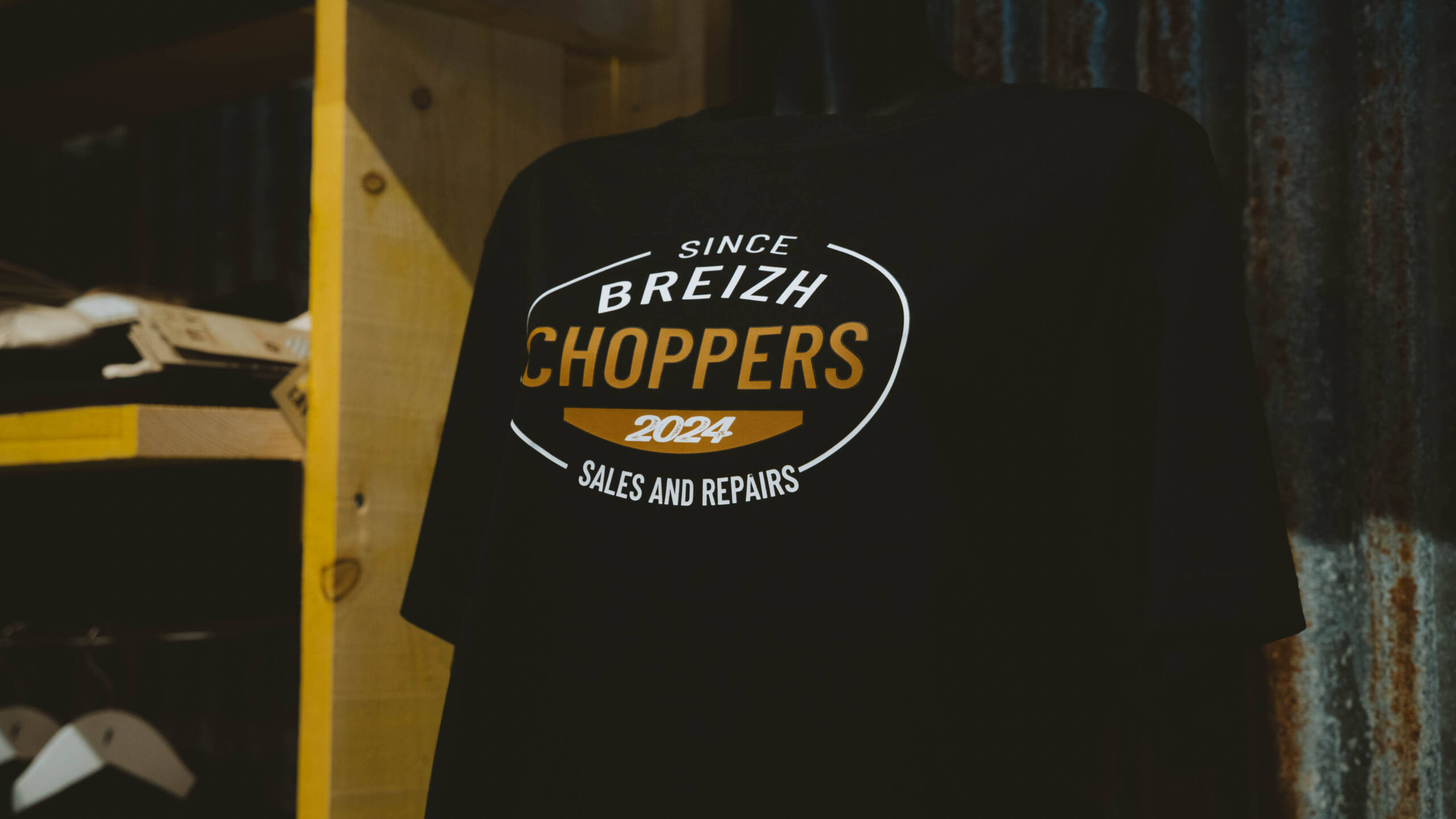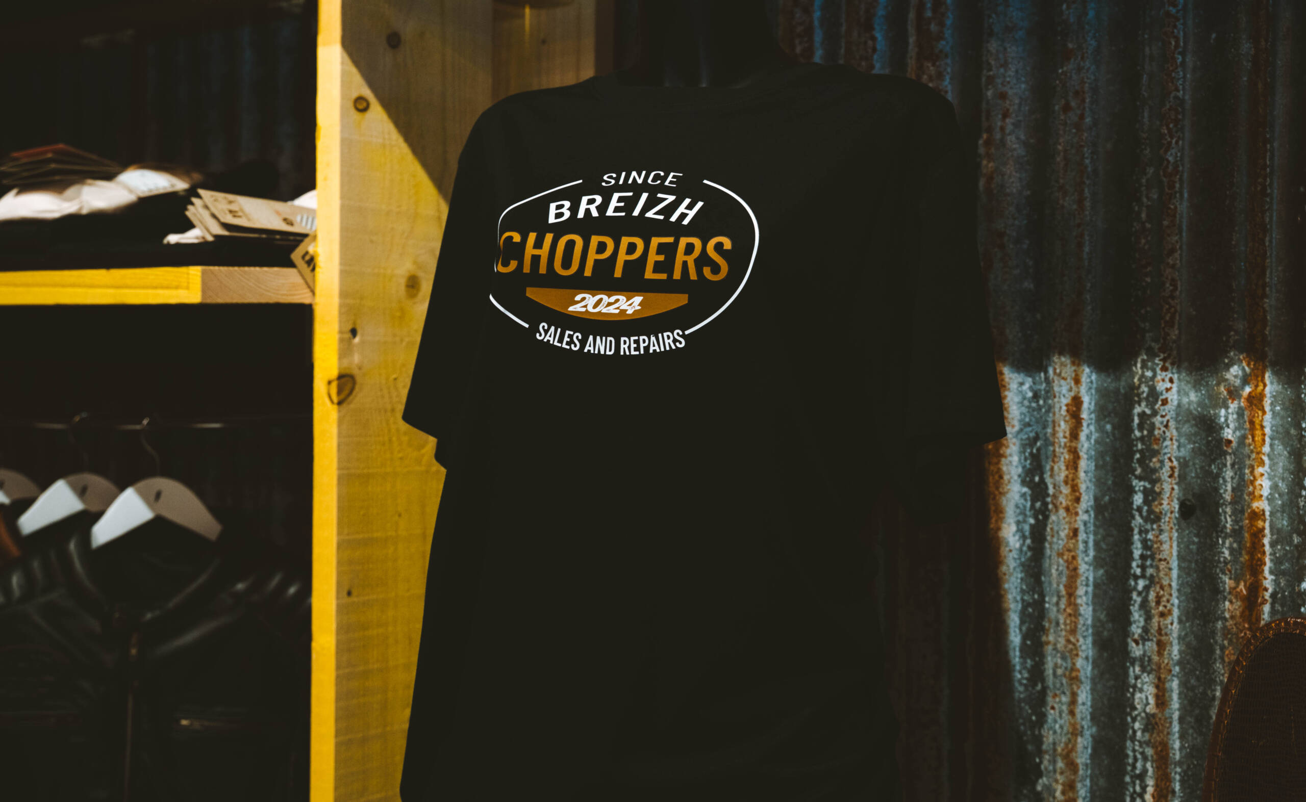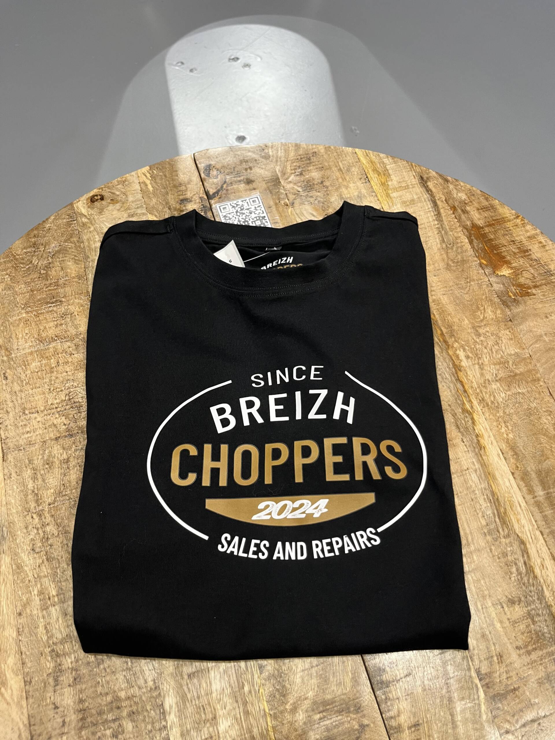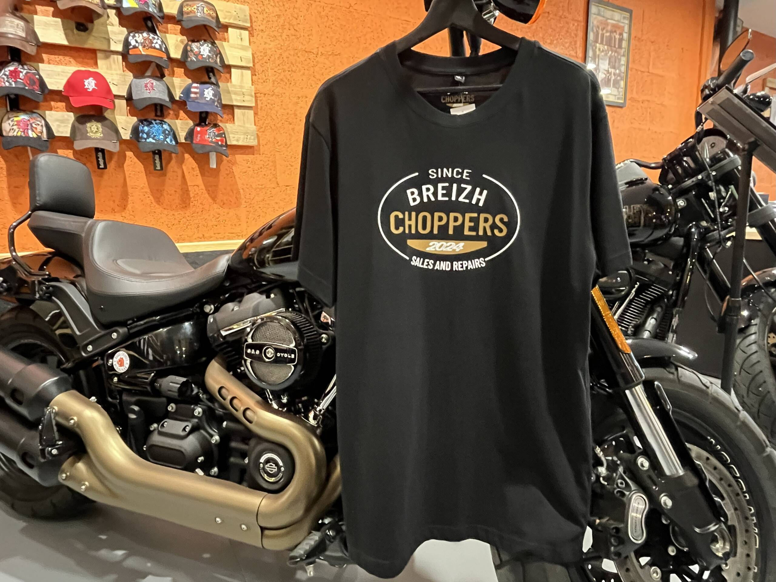Visuel central “Breizh Choppers – Since 2024”, sérigraphié en blanc et doré.
