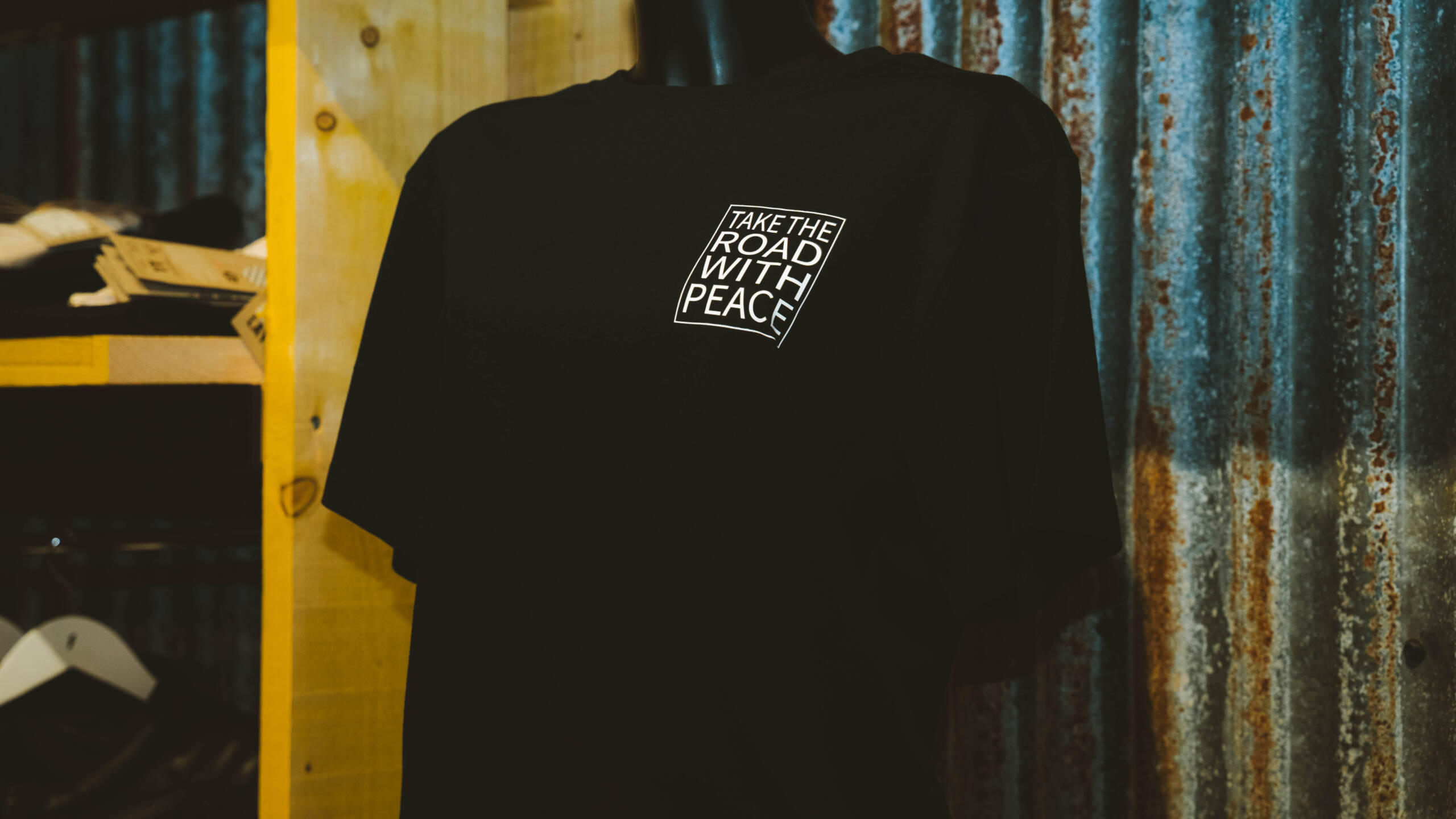 Design sobre : logo “take the road with peace” sérigraphié sur le coeur,